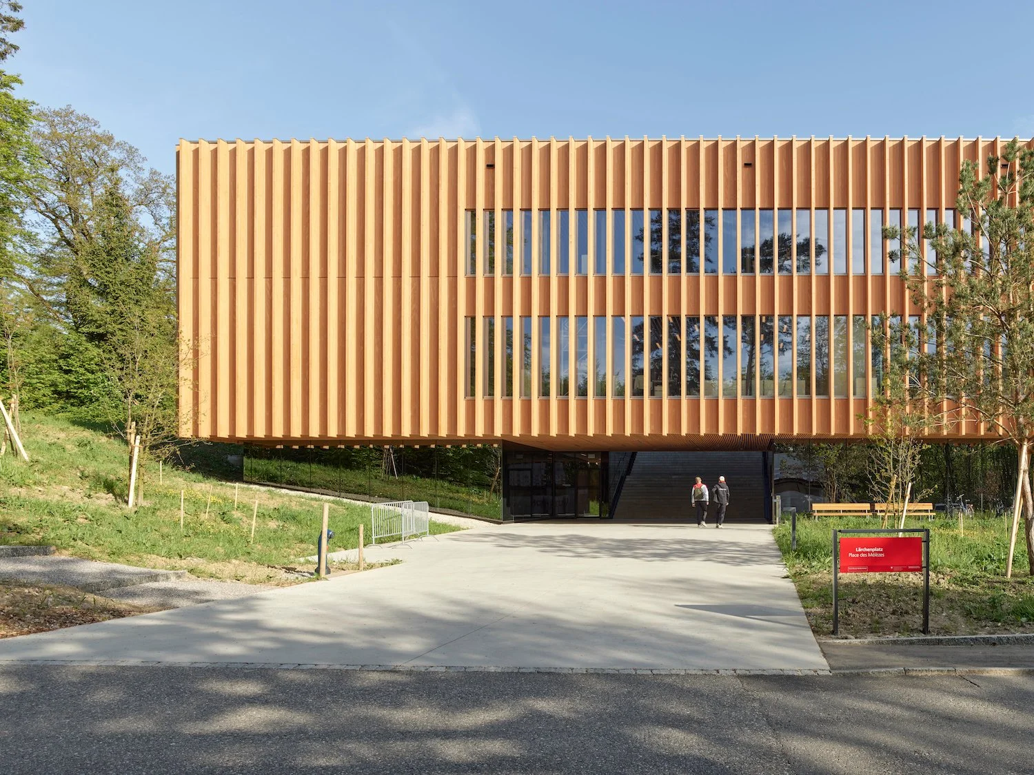 Dank der Integration von Holz in die Fassade fügt sich das Gebäude optimal in seine Umgebung am Wald ein. Die entstandene Rasterung zitiert zudem die Solothurner Schule und nimmt damit Bezug auf das bestehende Hauptgebäude des BASPO von Max Schlup.
